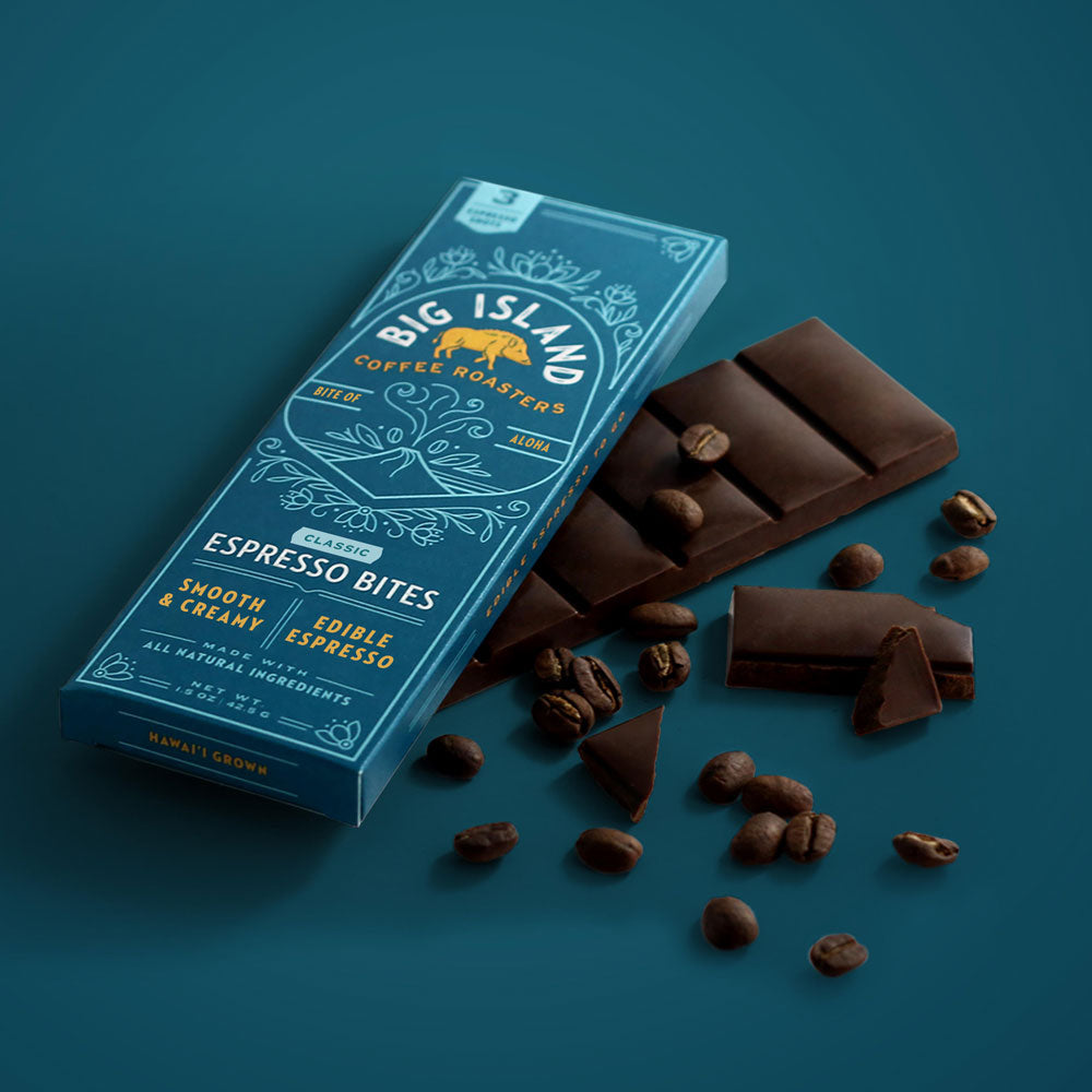 エスプレッソバイツは「かじるエスプレッソ」の名のとおり、水なしでそのまま味わう板コーヒーです。チョコレート成分を使わず、合成香料に頼らずに、ハワイ産コーヒーの香り高さとスムーズな口当たりを再現しました。少量のオーガニックシュガーとバニラビーンズなどを使用し、自然な甘みと本格ハワイ産コーヒーの味わいをお楽しみいただけます。